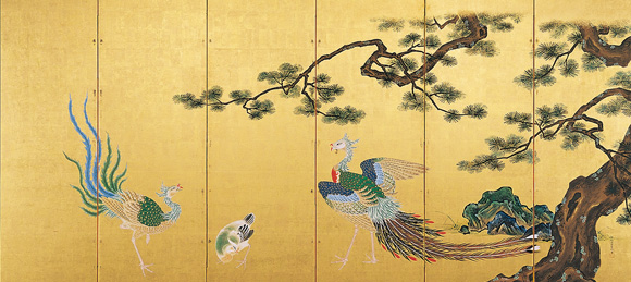 表:紙本金地着色、裏:紙本金地墨画、六曲一双屏風