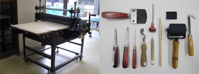 銅版画プレス機・ウォーマー・ニードル・ルーレット・バニシャー・スクレーパー・アクリルカッター・ビュラン・鉄やすり・ロッカー・ゴムローラー・ゴムベラ・インク練りベラ・インク練り板