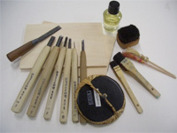 彫刻刀・見当のみ・ばれん・木版画用ブラシ・木版画用刷毛・はこび・絵皿