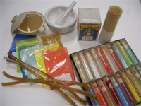 乳鉢・乳棒・にかわ鍋・砂子筒・硯・絵皿・筆・刷毛