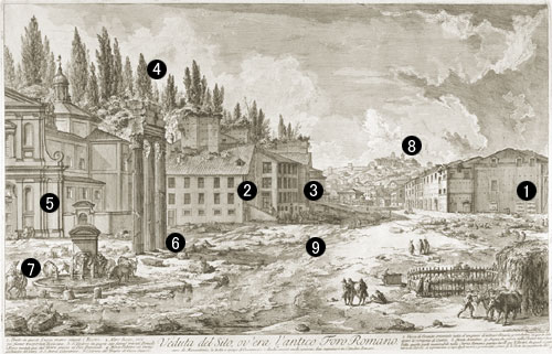 (1)秣小屋。ロストラ[演説用基壇]はここに位置していた
