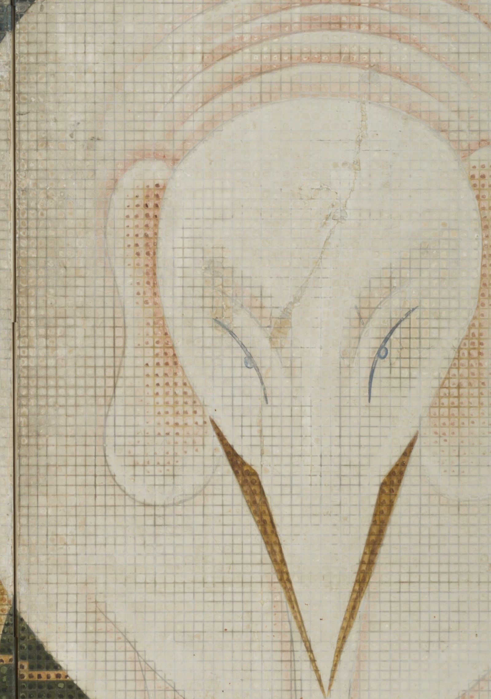 画面全体に方眼を施す特異な描法で注目されるこの屛風。