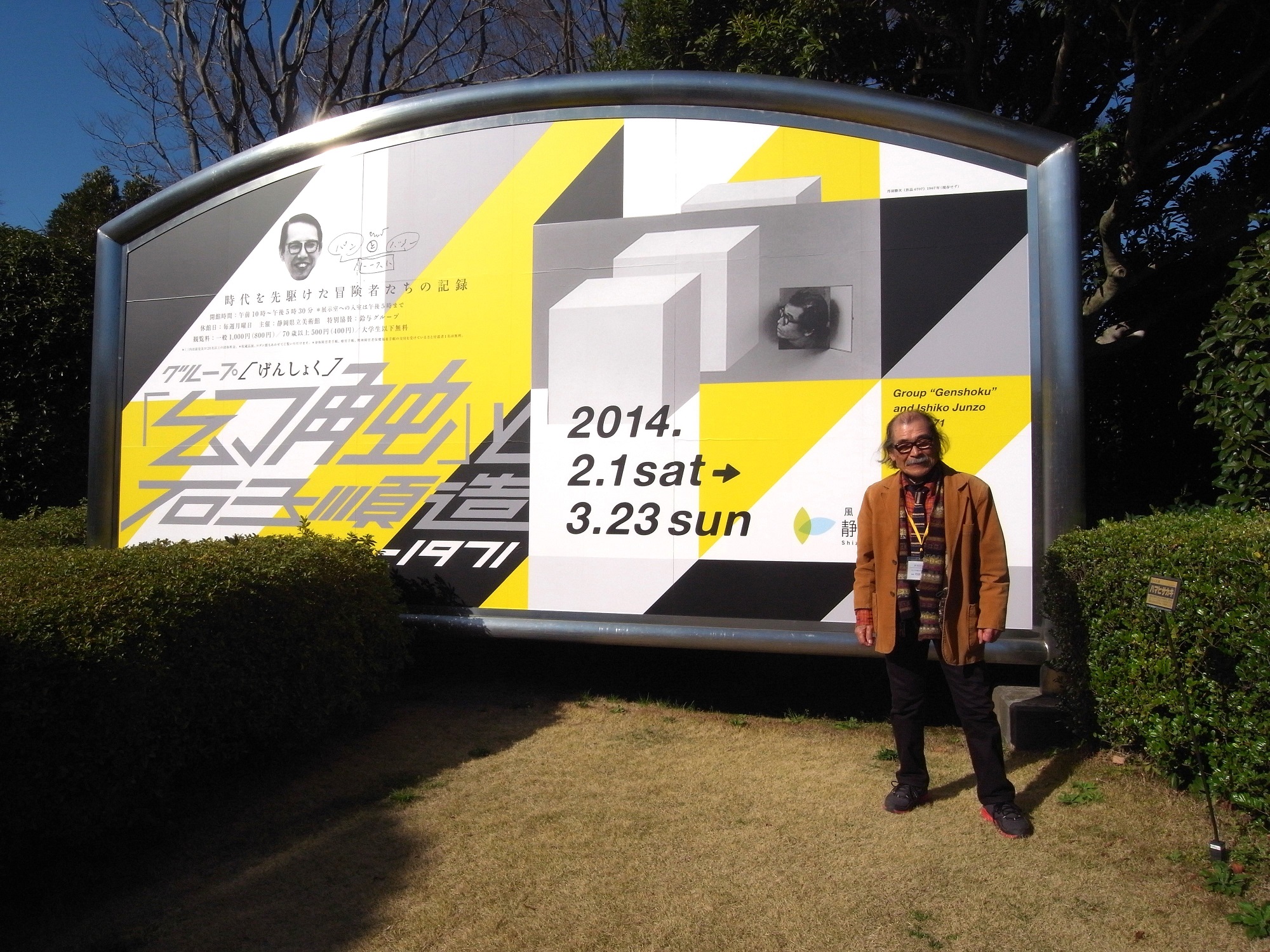 2014年、グループ『幻触』と石子順造」展看板前にて(写真提供:白井嘉尚氏)