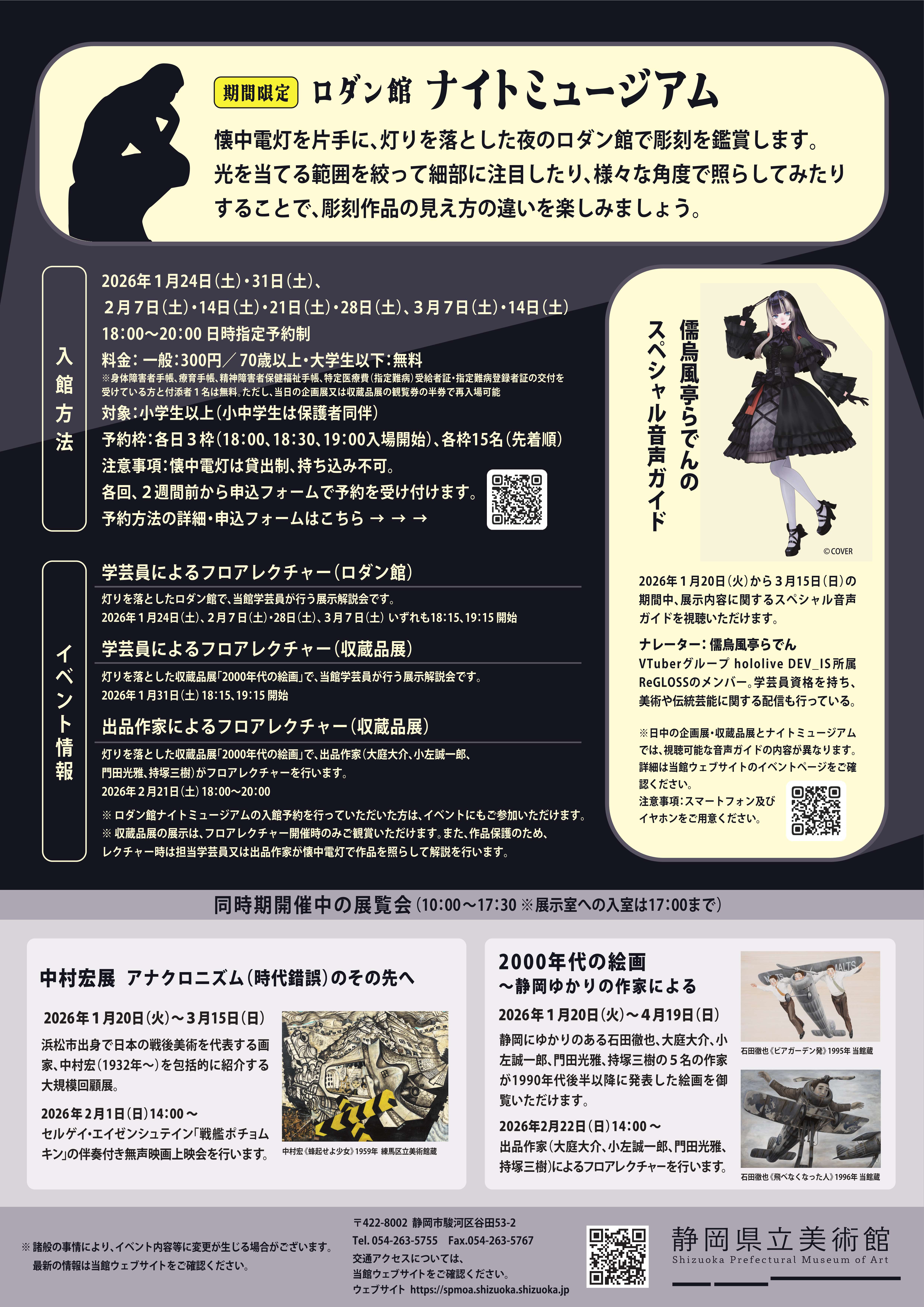 ①学芸員によるフロアレクチャー(ロダン館) 2026年1月24日(土)、2月7日(土)・28日(土)、3月7日(土) 各日18:15、19:15開始で1日2回開催します。灯りを落としたロダン館で、当館学芸員が行う展示解説会です。 ②学芸員によるフロアレクチャー(収蔵品展) 2026年1月31日(土) 18:15、19:15開始で2回開催します。灯りを落とした収蔵品展「2000年代の絵画」で、当館学芸員が行う展示解説会です。 ③出品作家によるフロアレクチャー(収蔵品展) 2026年2月21日(土) 18:00~20:00灯りを落とした収蔵品展「2000年代の絵画」で、出品作家(大庭大介、小左誠一郎、門田光雅、持塚三樹)がフロアレクチャーを行います。 ※ ロダン館ナイトミュージアムの入館予約を行っていただいた方は、イベントにもご参加いただけます。 ※ 収蔵品展の展示は、フロアレクチャー開催時のみご観賞いただけます。また、作品保護のため、レクチャー時は担当学芸員又は出品作家だけが懐中電灯で作品を照らして解説を行います。一般の来館者様におかれましては、絵画作品を懐中電灯で照らすことはご遠慮ください。 |